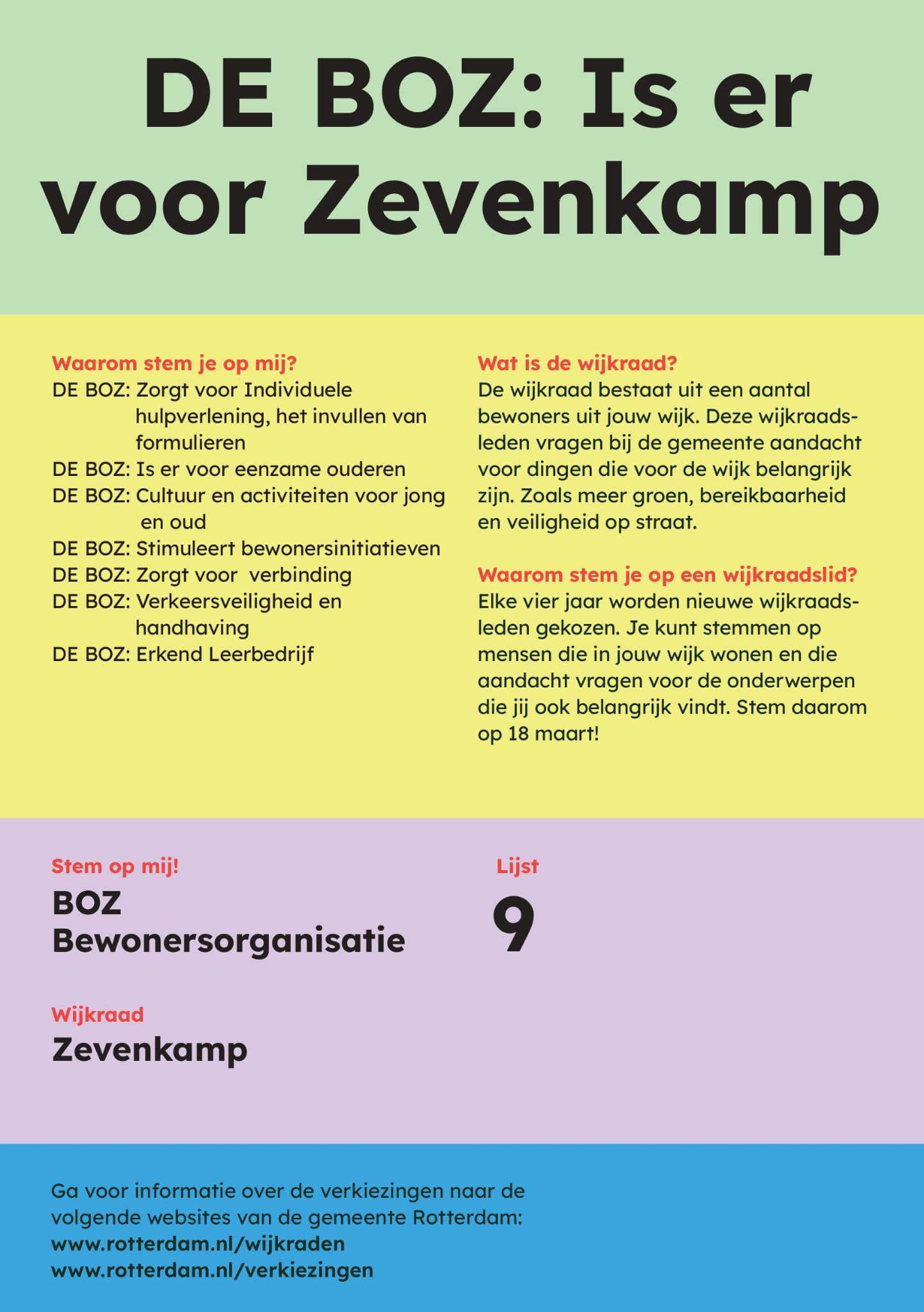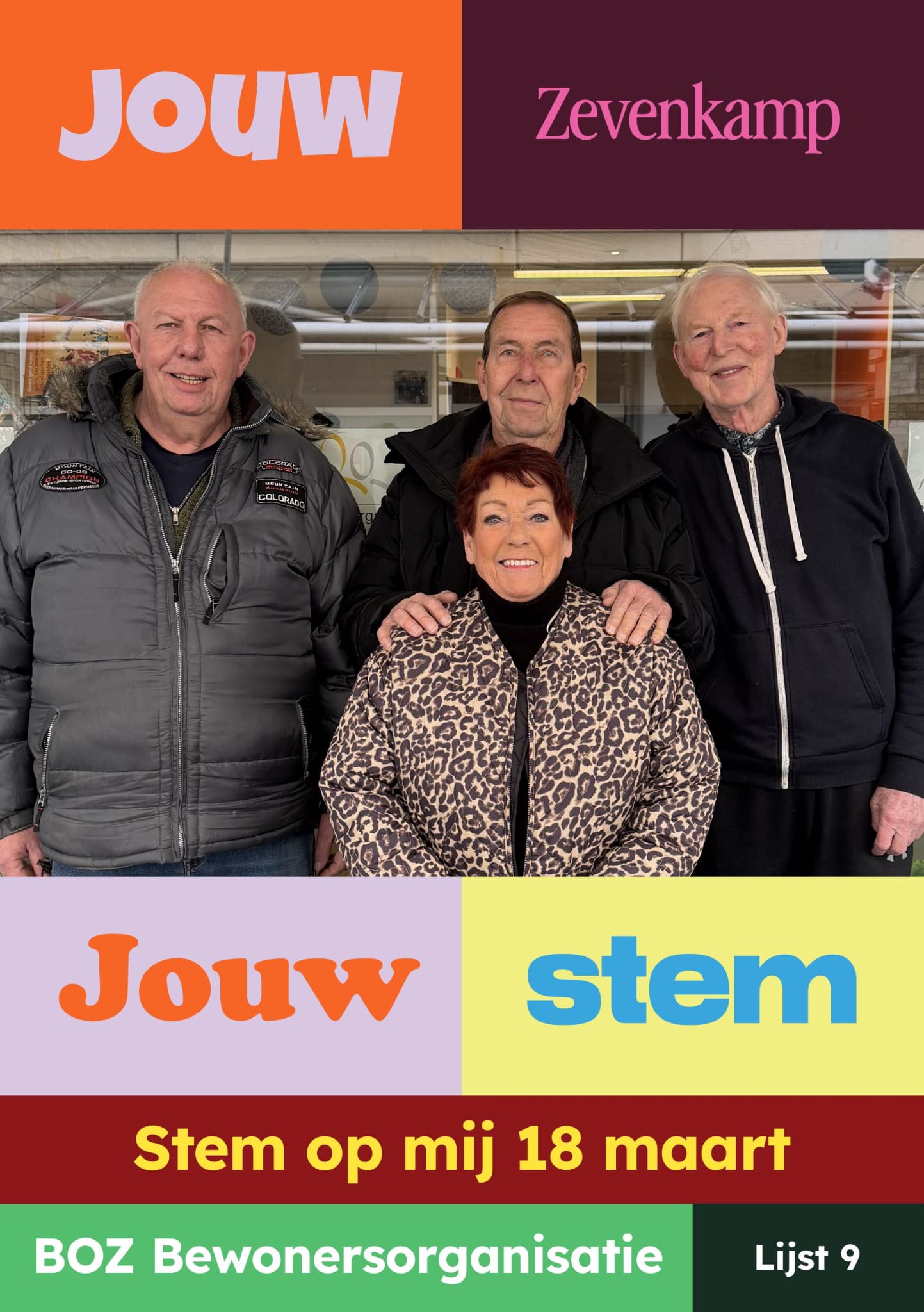 Fernande van Dongen-van der Pluijm, Joop van Dongen zijn bekend in de wijk wonen er al vanaf 1984. Len Moerman woont er al vanaf 2018. De Stichting BOZ stelt zich verkiesbaar als kandidaat voor de wijkraad. De BOZ doet aan individuele hulpverlening zoals formulieren invullen bijv. subsidie. De BOZ heeft een klusjesman en een tuinvrouw tot hun beschikking voor de bewoners. De BOZ zorgen voor Cultuur in de wijk, voor de kinderen dans en theater les van docenten Hofpleintheater. De BOZ organiseert vakantiebestedingen op het Ambachtsplein u weet wel de 3 zomerzaterdagen. Vrijheidssoep, Gouwe Ouwe en Pleinbioscoop, Gevelconcert. De BOZ stimuleren bewonersinitiatieven en zijn persoonlijk benaderbaar. Belangrijk is de Zevenkrant die een gevarieerd beeld geeft van de wijk, ieder mag een redactioneel stukje insturen. U kunt elke vrijdagmorgen bij de BOZ terecht voor wensen en ideeën, of kom eens langs voor een kopje koffie of thee. De BOZ doet veel aan Verbinden, vooral voor de ‘eenzame’ Senioren. De BOZ verzorgt ieder jaar een heerlijke busreis naar een leuke stad in Nederland, plus met de Museum bus een dagje Cultuur snuiven. ‘De BOZ net zoals de bewoners van Zevenkamp willen de oude Scheg terug met haar Gezelligheid en een plek voor buurtbewoners met een kopje koffie. De foyer is bij uitstek een ontmoetingsplek voor de bewoners en moet als dusdanig ingericht worden. Bewoners kunnen er ook met hun laptop werken. Het Huis van de Wijk dient het faciliteren van alle ruimtes voor bewonersinitiatieven onder de loep te nemen. Bij besloten theatervoorstellingen moet je in de pauze een zwak alcoholisch drankje kunnen nuttigen. Vrijwilligers en hun initiatieven moeten meer centraal staan.’ De BOZ wil ook veel meer Veiligheid in de wijk betreft meer handhaving, die bespreekbaar en zichtbaar zijn, een 30 km zone in de gehele wijk. Een zebrapad bij de metro Nieuw Verlaat naar Dirk van de Broek (Zevenkampse Ring). Een draaiverbodsbord op de Zevenkampse weg. Wij Kandidaten van de BOZ willen ons hier hard voor maken. Stem op de BOZ woensdag 18 maart.